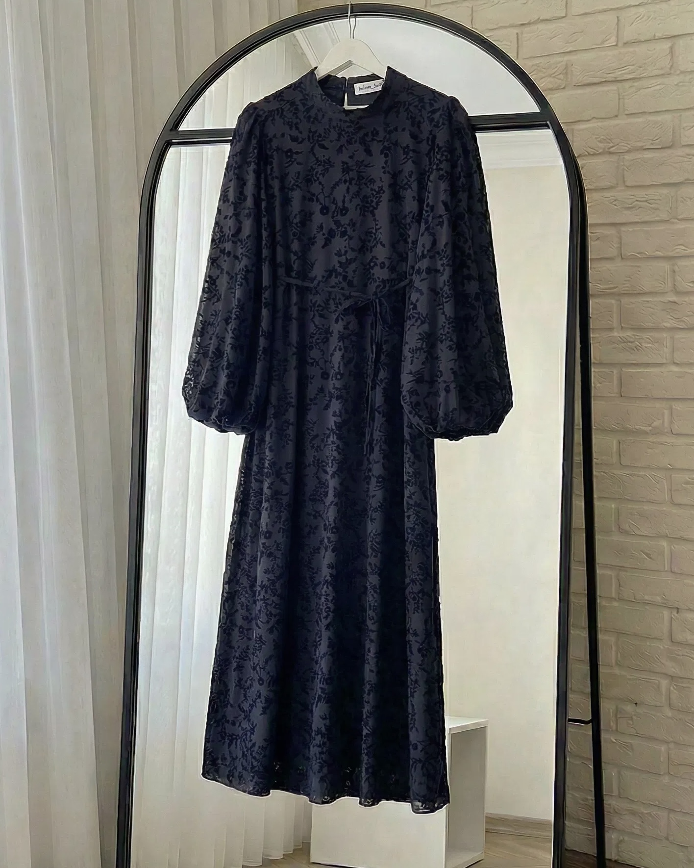 Flok desenli tül kumaştan, astarlı yapısıyla iç göstermez.•