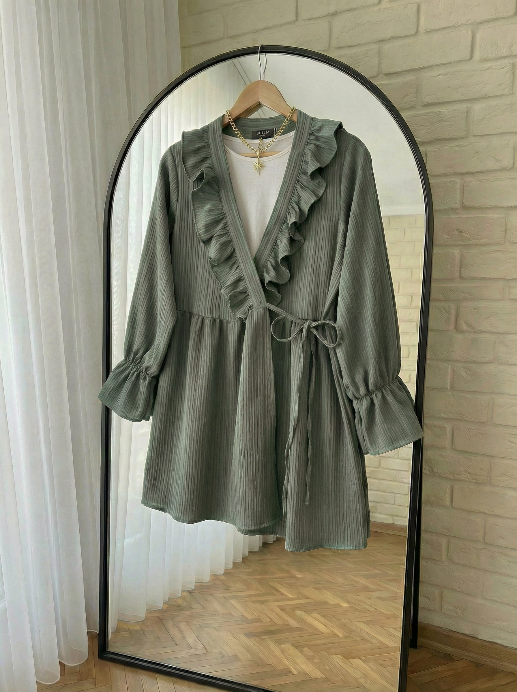 • Detay: Kol ve yakası fırfırlı, belden ip bağcıklı