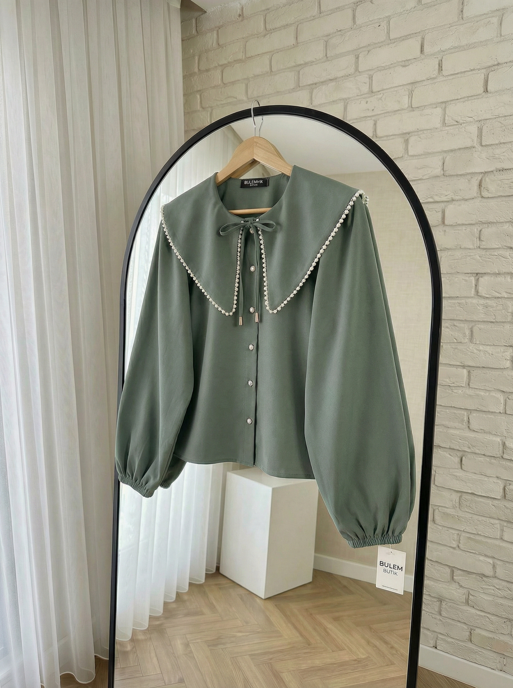 • Detay: İnci işlemeli yaka ve bağlama detayı
